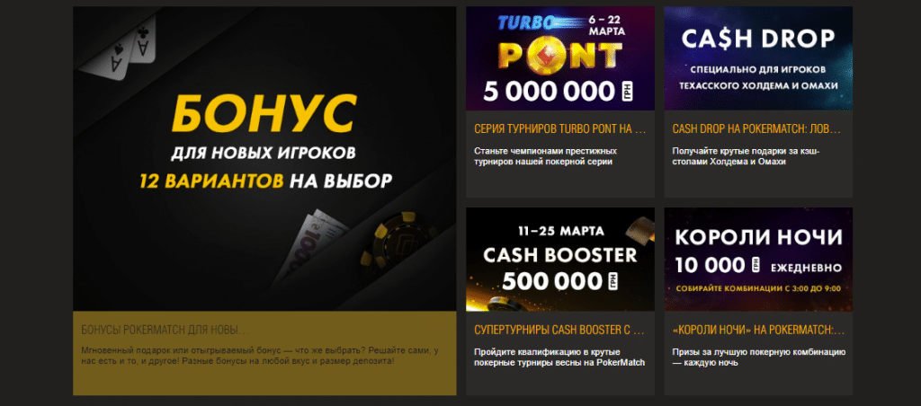 Во много рум прославился благодаря щедрым бонусам и акциям. И впечатляют не только размеры подарков, но и их количество — акций Покер Матч действительно много. И вот только некоторые из них: